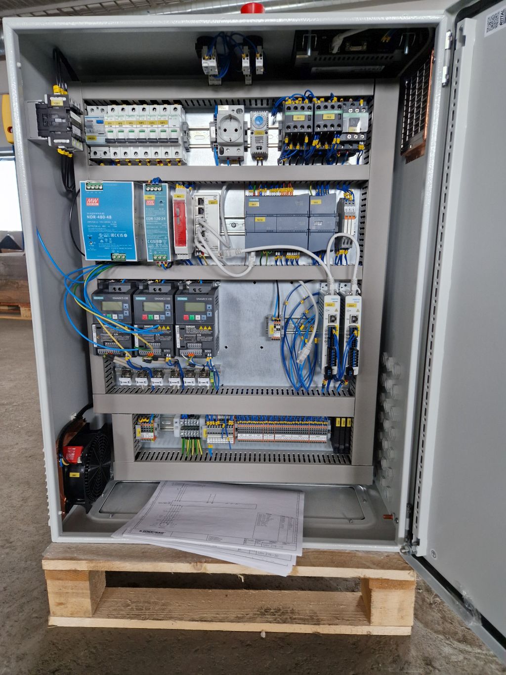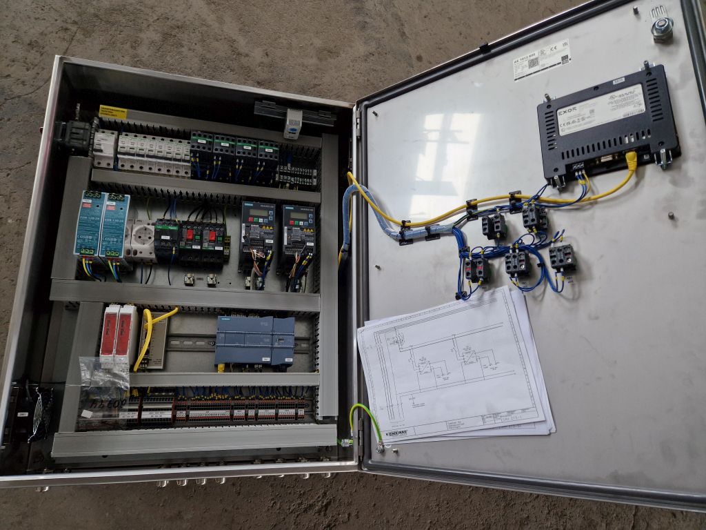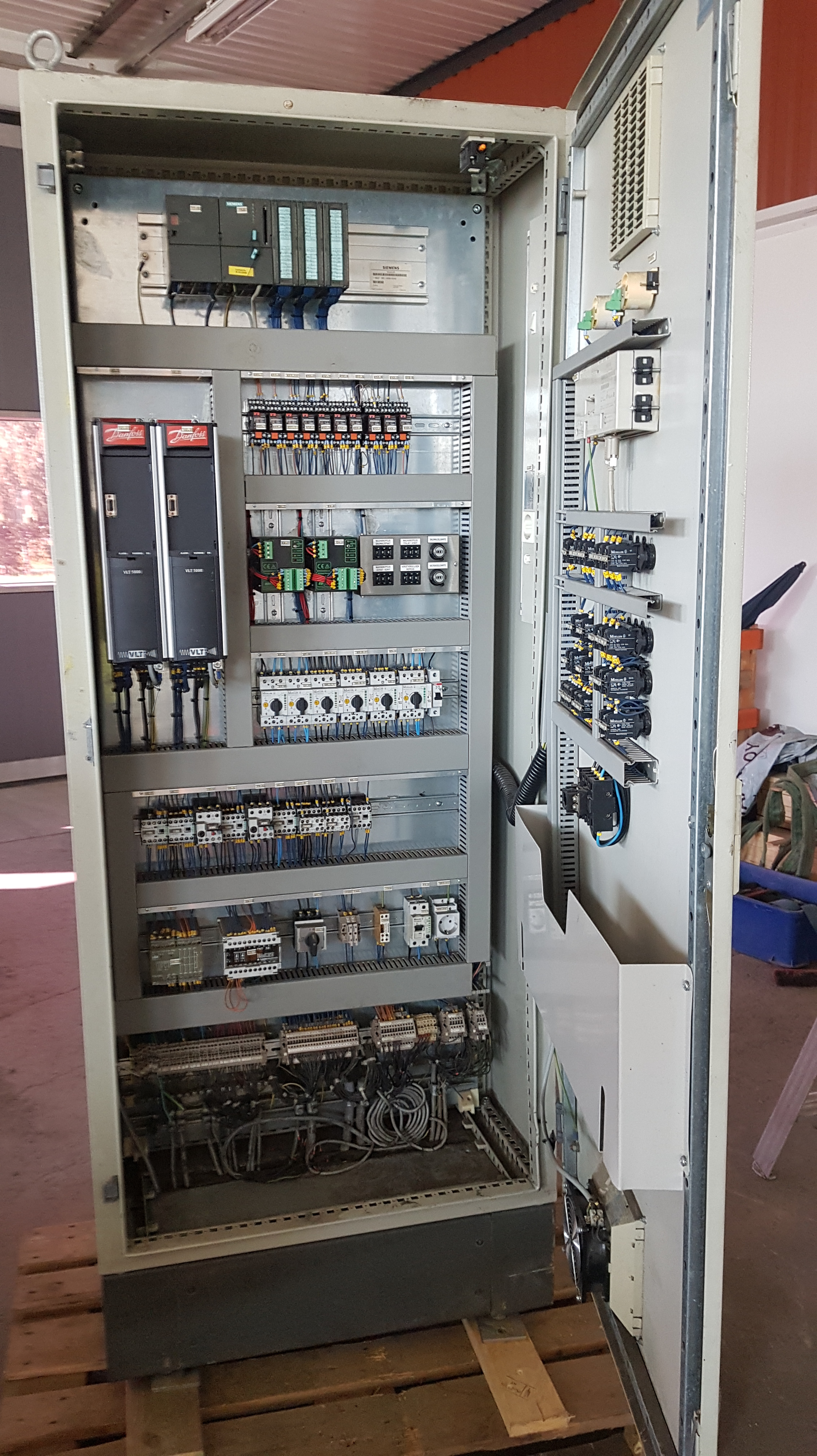 Automaatiokaappi, 2 kpl taajuusmuuttajia, moottorilähdöt, Siemens S7 tekstinäyttö