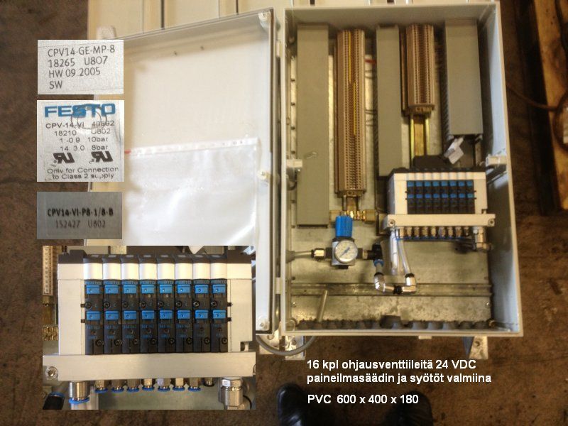 PVC-ohjauskaappi 600 x 400 x 180 mm. Riviliittimiä ja Festo- magneettiventtiilit 24 VDC. Ilmaletkut 6 mm