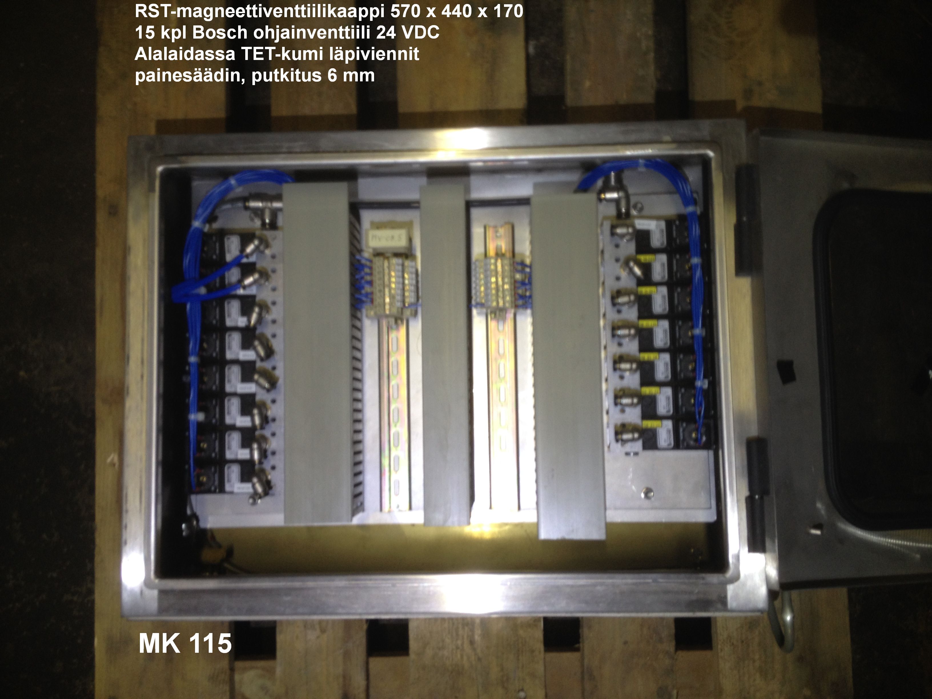 RST-mv-ohjauskaappi 570 x 440 x 170 mm. Bosch magneettiventtiilit 15 kpl, paineilmaletkut 6 mm. Kaappeja on useita.