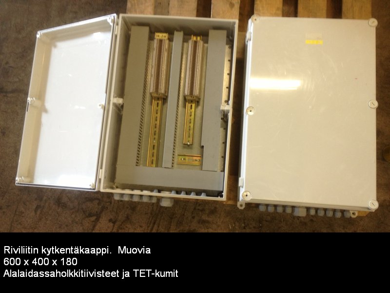 Muovinen riviliitinkaappi. 600x400x180 mm. Saranoitu ovi. Pohjassa paljon holkkitiivisteitä ja TET-kumiläpivientejä